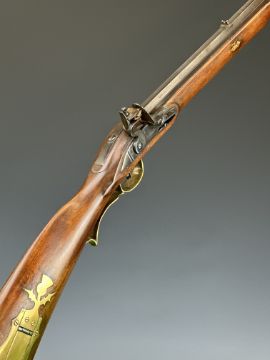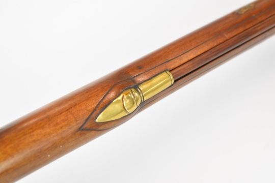 Deactivated William Buchele .45 flintlock Kentucky rifle with brass trigger guard, butt plate and storage compartment to the stock, fixed sights, brass tipped wooden ram-rod and 39 inch barrel, overall length 141.5cm, serial number RN180723BPH, with deactivation certificate dated 06/03/24 and book Recreating The American Longrifle by William Buchele, George Schumway and Peter A Alexander.