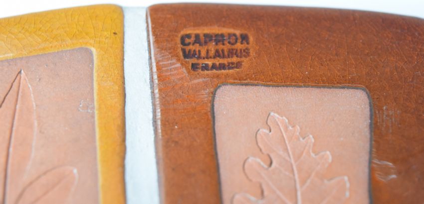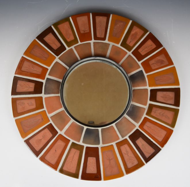 Roger Capron mid century modern circular tile mirror with leaf decoration, impressed 'Capron Vallauris France', diameter 49cm