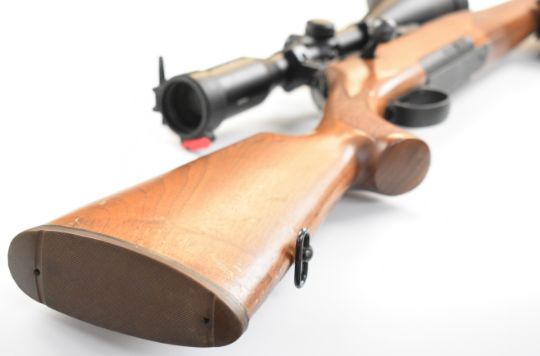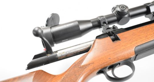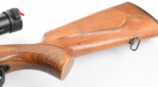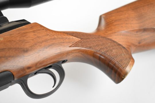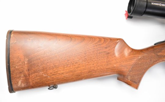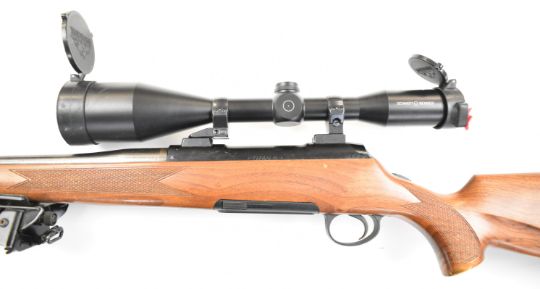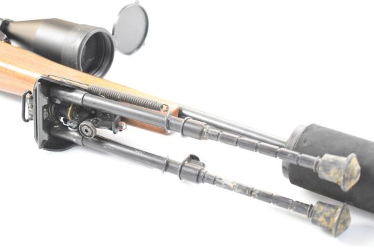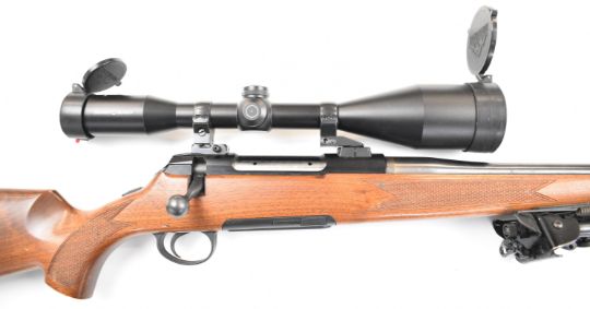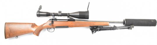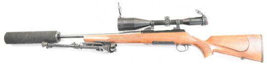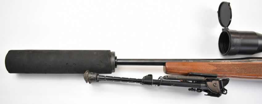 Titan .243 bolt-action rifle with chequered semi-pistol grip and forend, raised cheek piece, bi-pod, Schmidt & Bender Klassik 8x56 scope, sound moderator and 26.5 inch barrel, overall length 118cm, serial number 6737, with scope instruction bookletPLEASE NOTE THAT A VALID RELEVANT FIREARMS CERTIFICATE IS REQUIRED TO HANDLE/PURCHASE THIS ITEM.