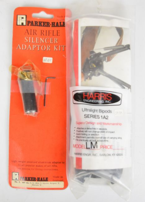 Sixteen air rifle accessories comprising four bi-pods and bi-pod mounts and 12 sound moderators including Harris, Parker-Hale, Air Arms, The Logan Silencer etc, most in original packaging.