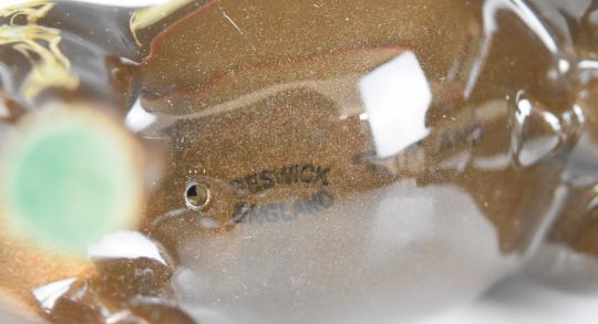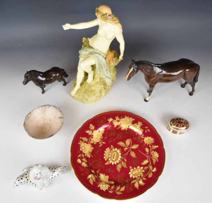 Royal Dux nude porcelain figurine, Beswick / Villeroy and Boch animal figures, Wedgwood Tonquin dinner plate, studio pottery dish, Royal Crown Derby Imari trinket box etc, tallest 32cm