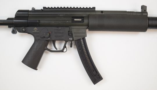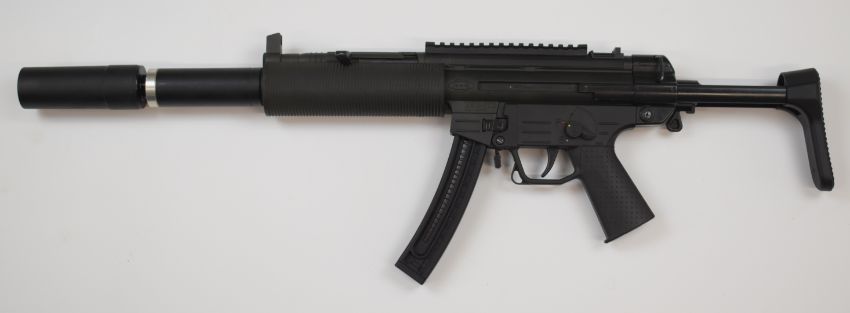 German Sport Guns (GSG) 522 .22 semi-automatic assault style rifle with textured pistol grip, tactical stock, three curved multi-shot magazines, rotary drum magazine, scope rail, sound moderator and 19 inch barrel, serial number A703226, in hard carry case with related paperwork. PLEASE NOTE THAT A VALID RELEVANT FIREARMS CERTIFICATE IS REQUIRED TO HANDLE/PURCHASE THIS ITEM.