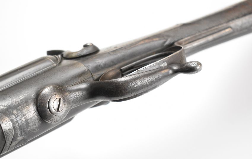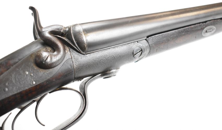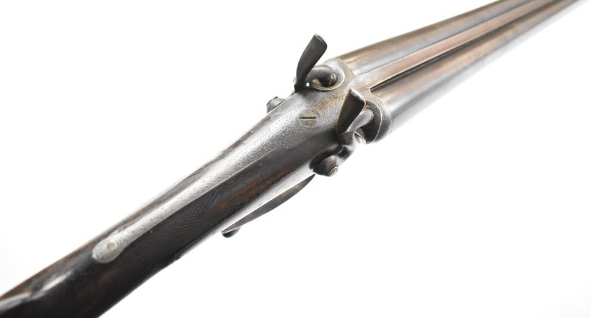 James Beattie & Son 12 bore side by side hammer action shotgun with named and engraved locks, engraved rotary underlever, trigger guard, top strap and hammers, double trigger, chequered grip and forend, vacant cartouche to the underside of the stock, grip safety, double trigger and 30 inch Midland Gun Company barrels choked ½ and cylinder, overall length 117.5cm, length of pull 36.5cm, serial number NVSN. PLEASE NOTE THAT THIS GUN IS BEING SOLD AS STOCK AND ACTION ONLY AND THAT A VALID RELEVANT RFD CERTIFICATE IS REQUIRED TO VIEW OR PURCHASE THIS LOT.