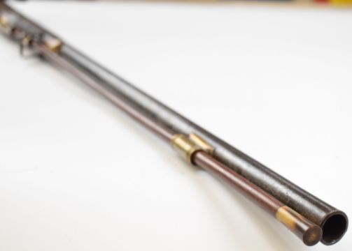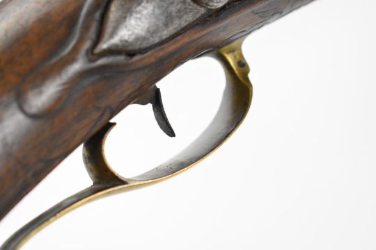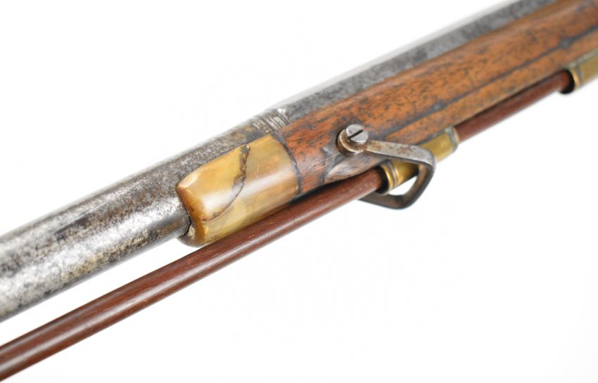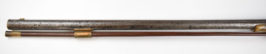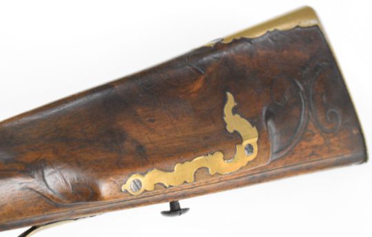 Tyrolean or Austrian flintlock wildfowling or sporting gun with engraved lock and hammer, carved and engraved stock, brass scrolling trigger guard, butt plate and mounts, horn-tipped forend and ram-rod, sling mounts, raised cheek piece and 32 inch part-octagonal smooth bored barrel, overall length 122cm.