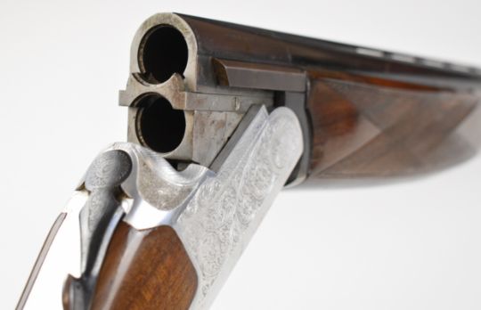 Lanber 12 bore over and under shotgun with engraved locks, underside, trigger guard and thumb lever, chequered semi-pistol grip and forend, single trigger, vented top rib and 27.5 inch barrels choked ½ and ¼, overall length 116.5cm, length of pull 40cm, serial number 159289. PLEASE NOTE THAT A VALID RELEVANT SHOTGUN CERTIFICATE IS REQUIRED TO VIEW OR PURCHASE THIS LOT AND FOR ALL SHOTGUNS OR RIFLES PLEASE ENSURE YOU HAVE THE RELEVANT CERTIFICATE BEFORE BIDDING.