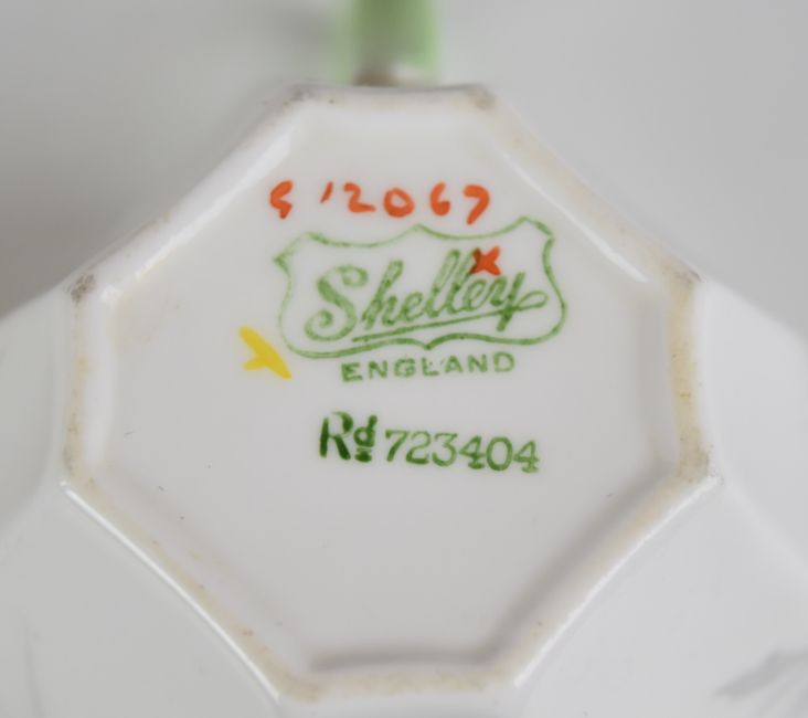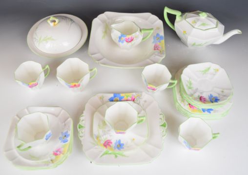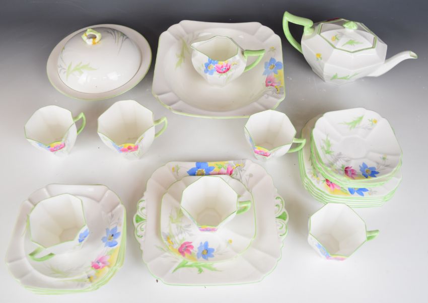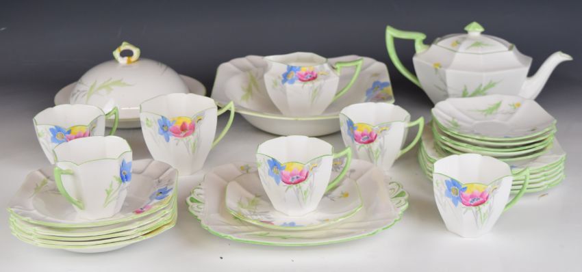 Shelley porcelain tea set decorated in the Anemone pattern, Queen Anne shape no 12067, approximately twenty seven pieces, tallest 18cm