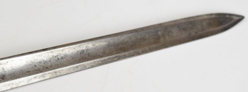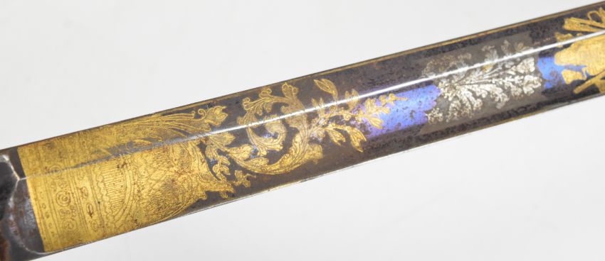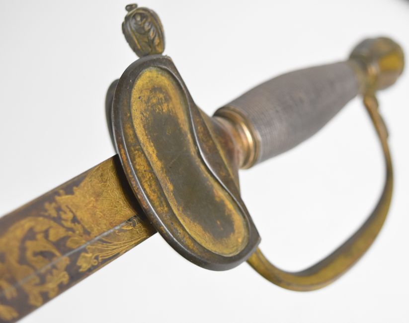 British 1796 pattern Infantry officer's sword with folding guard, wire bound grip, Osborne to ricasso, 82cm straight flat back fullered blade retaining much of its blue and gilt decoration and scabbard. PLEASE NOTE: WE ARE NOT ABLE TO OFFER OUR USUAL POSTAGE SERVICE FOR THIS LOT