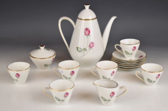 Hutschenreuther tea set decorated with pink roses, fifteen pieces, tallest 22cm
