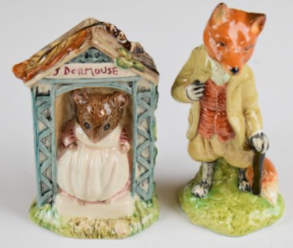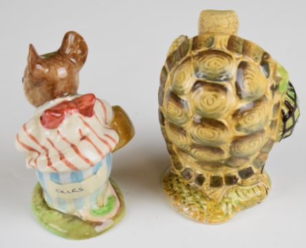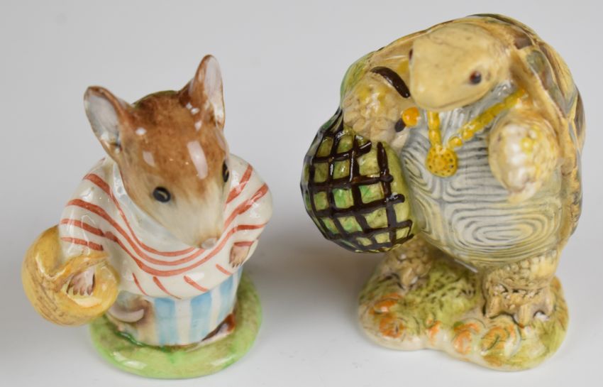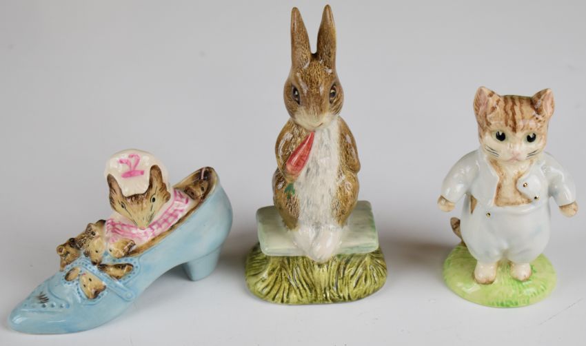 Sixteen Beswick / Royal Albert Beatrix Potter figures including Mrs Rabbit with BP2 gold oval backstamp, Peter Rabbit Gardening, No More Twist, Mrs Dormouse and a Royal Albert advertising plaque etc, nine boxed, tallest 12.5cm
