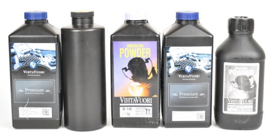 Five bottles of shotgun or rifle cartridge re-loading powder including Vihta Vuori Premium, N32C and N140. Please note we are not able to offer our usual postage service for this lot