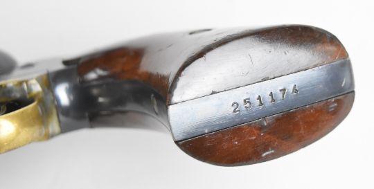 Pietta Remington Navy .36 six-shot single action revolver with brass trigger guard, walnut grips, adjustable sights and 6.5 inch octagonal barrel, overall length 33.5cm, serial number 251174. PLEASE NOTE THAT A VALID RELEVANT FIRARMS CERTIFICATE IS REQUIRED TO VIEW OR PURCHASE THIS LOT AND FOR ALL SHOTGUNS OR RIFLES PLEASE ENSURE YOU HAVE THE RELEVANT CERTIFICATE BEFORE BIDDING.