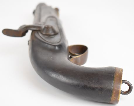 Enfield percussion hammer action Sea-Service pistol with lock stamped '1858 Enfield' brass trigger guard and butt cap, captive ram-rod, belt loop and 7.25 inch smooth bored octagonal barrel, overall length 34cm.