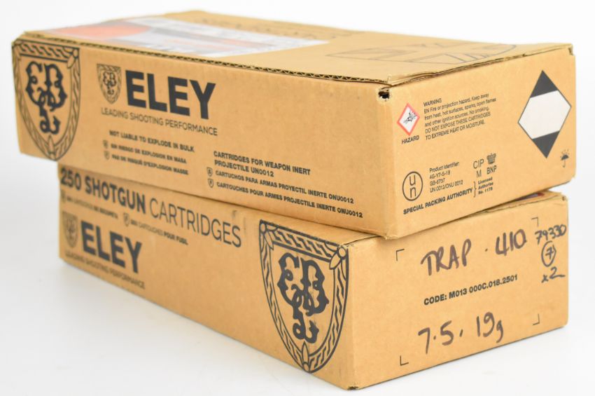 Five hundred .410 Eley Trap 19g 7.5 shot shotgun cartridges, all in original boxes. PLEASE NOTE THAT A VALID RELEVANT SHOTGUN CERTIFICATE IS REQUIRED TO VIEW OR PURCHASE THIS LOT AND FOR ALL SHOTGUNS OR RIFLES PLEASE ENSURE YOU HAVE THE RELEVANT CERTIFICATE BEFORE BIDDING. We are not able to offer our usual postage service for this lot