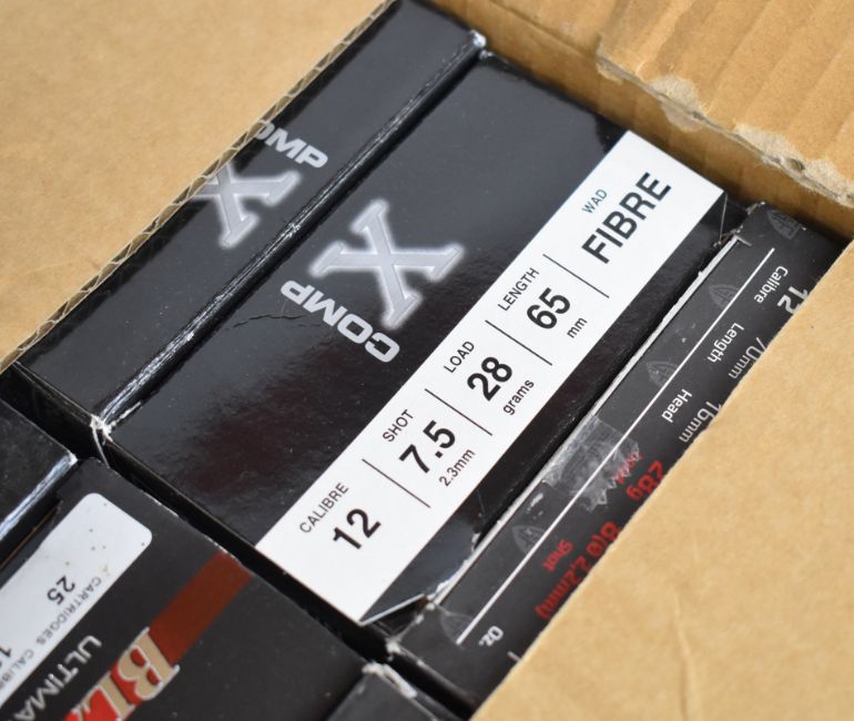 Five hundred 12 bore Hull Comp X 28g 7.5 shot shotgun cartridges, all in original boxes. PLEASE NOTE THAT A VALID RELEVANT SHOTGUN CERTIFICATE IS REQUIRED TO VIEW OR PURCHASE THIS LOT AND FOR ALL SHOTGUNS OR RIFLES PLEASE ENSURE YOU HAVE THE RELEVANT CERTIFICATE BEFORE BIDDING. We are not able to offer our usual postage service for this lot