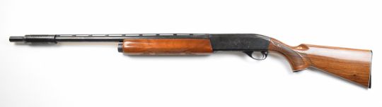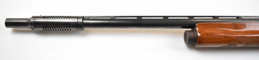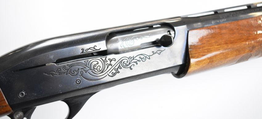 Remington Model 1100 12 bore 3-shot semi-automatic shotgun with ornately carved and chequered semi-pistol grip and forend, engraved lock and bolt, vented rib, Lyman Cutts compensator and 27.5 inch barrel, overall length 121.5cm, length of pull 35.5cm, serial number L709008V. PLEASE NOTE THAT A VALID RELEVANT SHOTGUN CERTIFICATE IS REQUIRED TO VIEW OR PURCHASE THIS LOT AND FOR ALL SHOTGUNS OR RIFLES PLEASE ENSURE YOU HAVE THE RELEVANT CERTIFICATE BEFORE BIDDING.