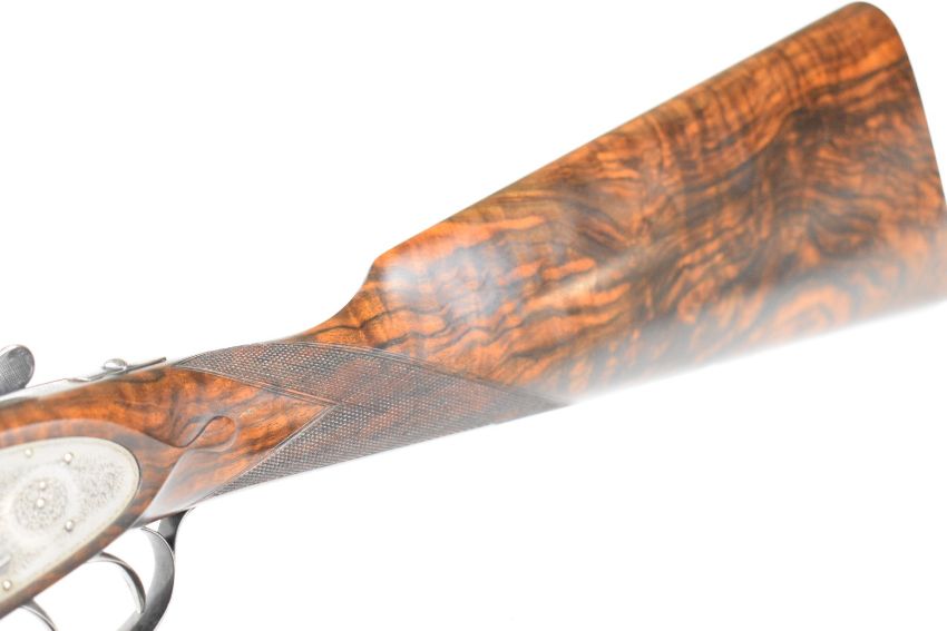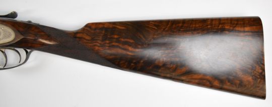 James Purdey & Sons 12 bore assisted-opening side by side sidelock ejector shotgun with hand detachable locks, fine rose and scroll engraving to the locks, underside, trigger guard, top plate, thumb lever and fences, chequered grip and forend, carved teardrop to the wrist, vacant cartouche to the underside of the stock, double trigger and named 30 inch barrels choked ¼ and ½, overall length 120.5cm, length of pull 39cm, serial number 23265, in fitted leather carry case with three original labels. PLEASE NOTE THAT A VALID RELEVANT SHOTGUN CERTIFICATE IS REQUIRED TO VIEW OR PURCHASE THIS LOT AND FOR ALL SHOTGUNS OR RIFLES PLEASE ENSURE YOU HAVE THE RELEVANT CERTIFICATE BEFORE BIDDING.