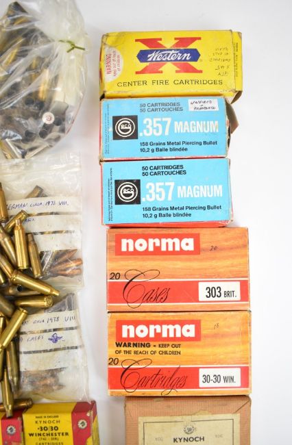 A large collection of mainly brass empty rifle cartridge cases including some primed examples, Kynoch 30-30 Winchester, .38 Spl, .270, .45 Colt, Kynoch .303 British, German Swastika stamped examples, .357 Magnum etc, many in original boxes. We are not able to offer our usual postage service for this lot