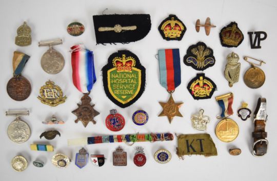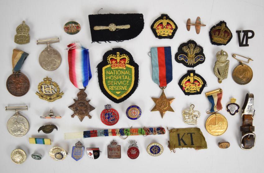 A collection of medals and badges including WW1 1914 Mons Star to 5353 PTE B. Wall, Monmouthshire Regiment, with an over stamp of his number, two WW2 War Medals, George V and Queen Victoria Commemoration Medals, RZM dagger clip, Home Front badges including Great War Comrades, A.R.P and W.V.S Rest Centre