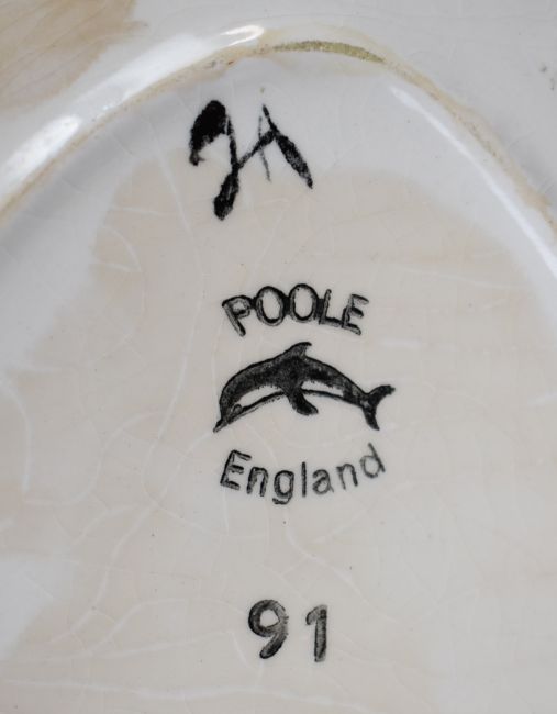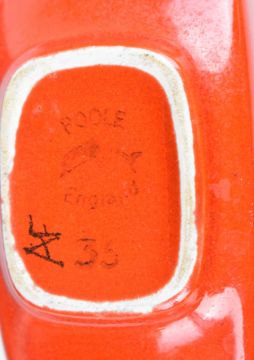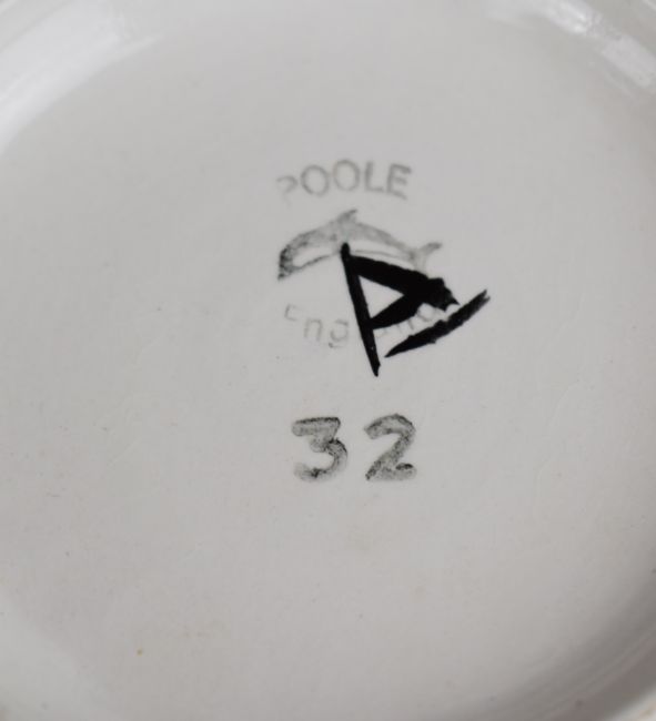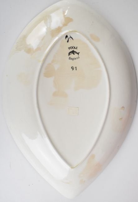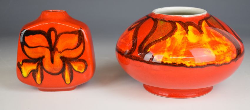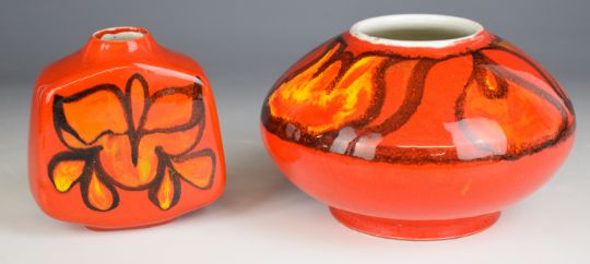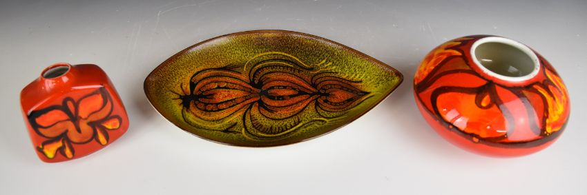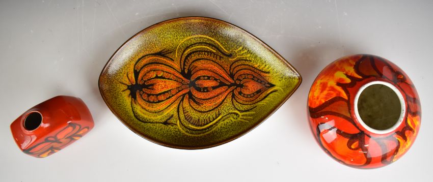 Two Poole Pottery mid century modern vases (tallest 11cm) and a dish, diameter 30cm