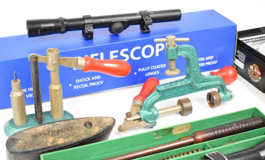 A collection of shotgun, rifle and cartridge re-loading accessories including rifle scopes Nikko Sterling Mountie 4x20 and Tiara 4x28, SMK Mil-Dot 4x40, 12 bore Barrelloc, butt plates, capper/ de-capper, wad punch etc.