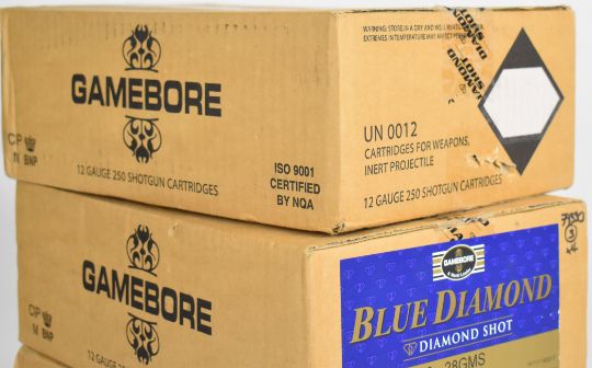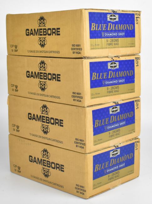 One thousand 12 bore Gamebore Blue Diamond 28g 9 shot shotgun cartridges, all in original boxes. PLEASE NOTE THAT A VALID RELEVANT SHOTGUN CERTIFICATE IS REQUIRED TO VIEW OR PURCHASE THIS LOT AND FOR ALL SHOTGUNS OR RIFLES PLEASE ENSURE YOU HAVE THE RELEVANT CERTIFICATE BEFORE BIDDING. We are not able to offer our usual postage service for this lot