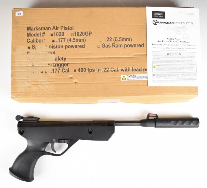 Beeman Marksman 1020 .177 target air pistol with textured composite grip, adjustable sights and barrel shroud, serial number 122204701249, in original box with instructions. PLEASE NOTE: IF YOU REQUIRE POSTAGE, THIS LOT CAN ONLY BE SENT TO AN RFD