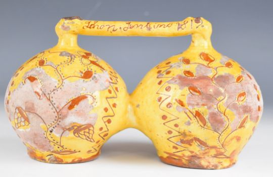 Evan Jenkins (1788-1856) for Ewenny Pottery very rare sgraffito decorated moneybox with double inscription to 'E Jenkins maker and Jhon Jenkins 1819', made at the Wick Road pottery by Evan Jenkins, W25 x D12 x H14cm Provenance: This moneybox is illustrated in Ewenny Potteries, Potters and Pots by Gweneth & Ieuan R Evans p135, fig 177. Consigned for auction by granddaughter of Edwin Jenkins