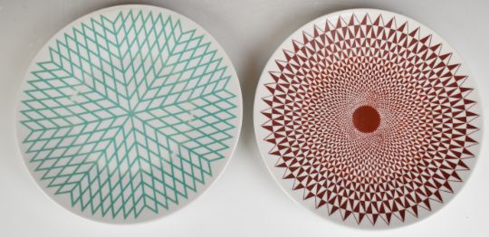 Two Italian Fornasetti Milano retro / mid century modern / Op Art plates decorated in the Egocentrismo design, largest diameter 28cm