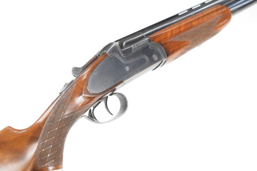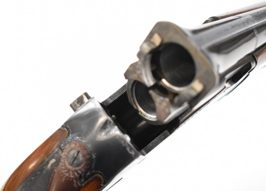 Sarasquetta 12 bore over and under ejector shotgun with border engraved sidelock plates, trigger guard, top plate and thumb lever, chequered semi-pistol grip and forend, double trigger, vented top rib and 28 inch barrels choked cylinder and ½, overall length 113cm, length of pull 36.5cm, serial number A2993. PLEASE NOTE THAT A VALID RELEVANT SHOTGUN CERTIFICATE IS REQUIRED TO HANDLE/PURCHASE THIS ITEM.