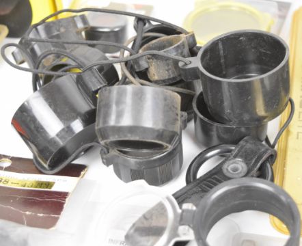 A collection of rifle scopes and accessories including two AGS Cobalt 2x20 scopes, two 6x42 scopes, lens covers etc, all in original boxes/ packaging.