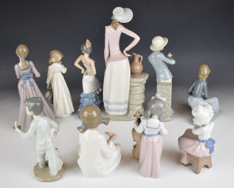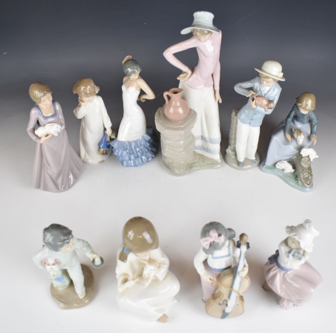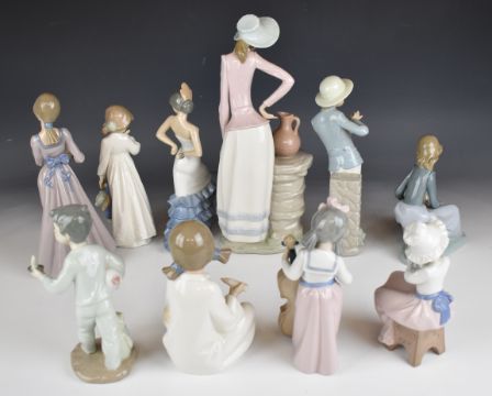 Ten Lladro / Nao figures including flamenco dancer, cellist, girl with urn etc, some boxed, tallest 33cm