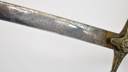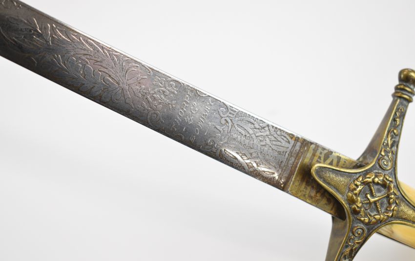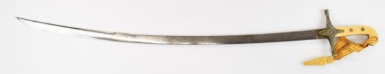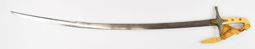 British 1831 pattern General officer's sword with guard and hilt mounts in gilt 'brass', ivory grip, floral headed rivets, 79cm decorated curved blade, scabbard and knot. This lot has an ivory licence. PLEASE NOTE: WE ARE NOT ABLE TO OFFER OUR USUAL POSTAGE SERVICE FOR THIS LOT