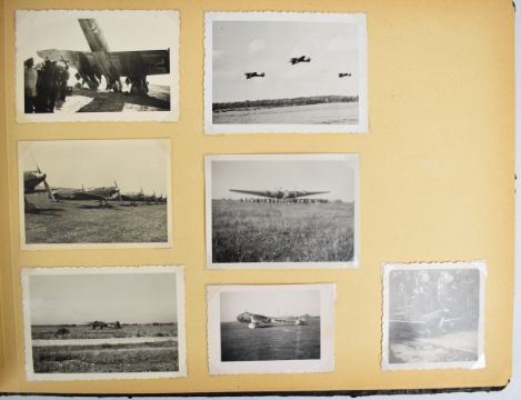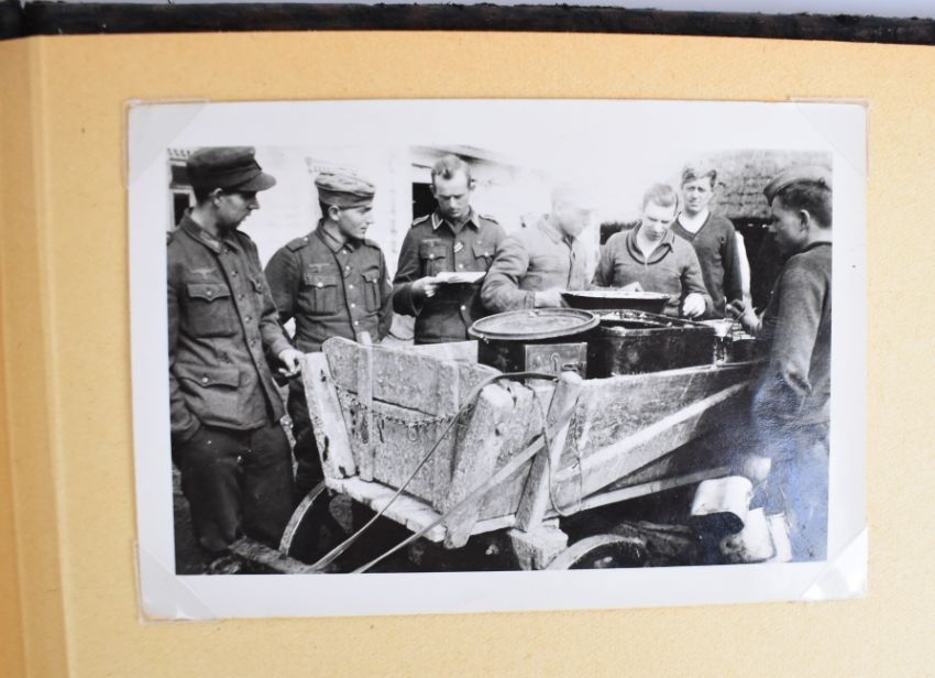 German WW2 Nazi Third Reich photo album containing twenty nine photographs including horse drawn artillery, bicycle repair, ration containers being carried by soldiers, aircraft etc.