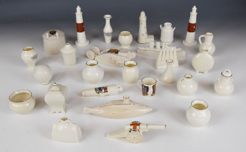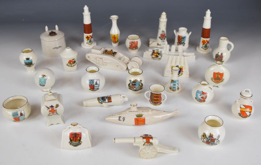Collection of crested ware, mainly Goss, Shelley, Carlton and Arcadian, with crests including Reading, Gloucester, Bradford, Enfield, Bishops Stortford, Hastings, Blackgang, York, Kings Lynn, Swanage etc, tallest 12cm