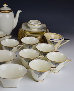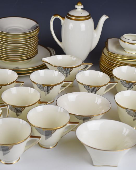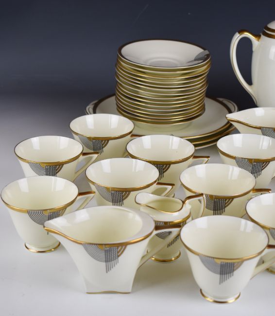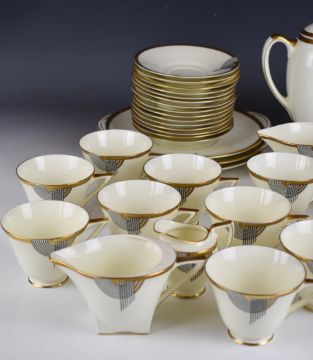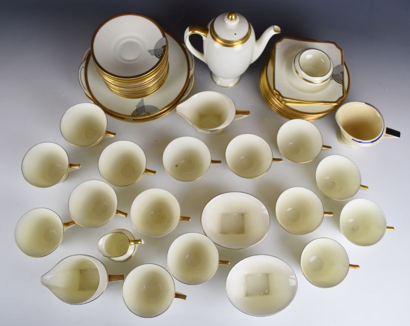 Royal Doulton Art Deco teaware decorated in the black and gold Tango pattern with additional milk jug, approximately fifty four pieces, tallest 21cm