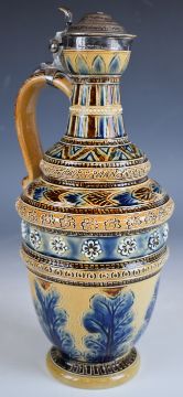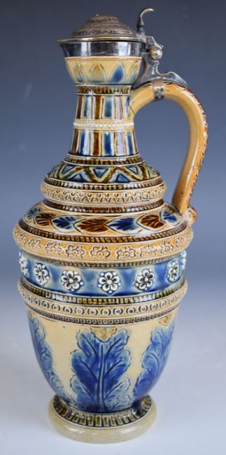 Doulton Lambeth art pottery ewer with hallmarked silver mounts, H26cm