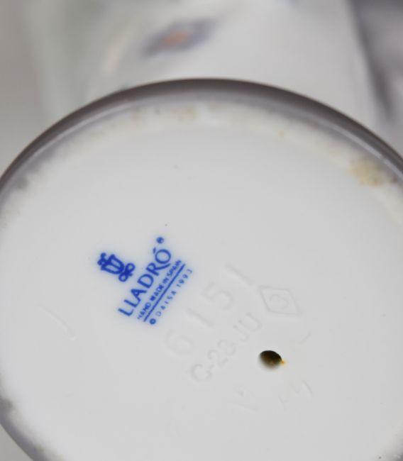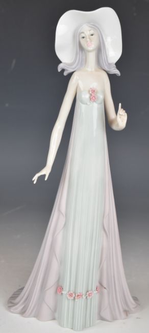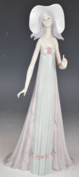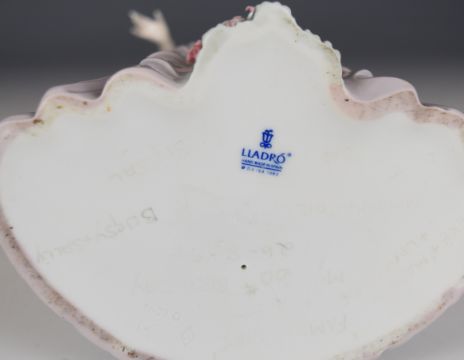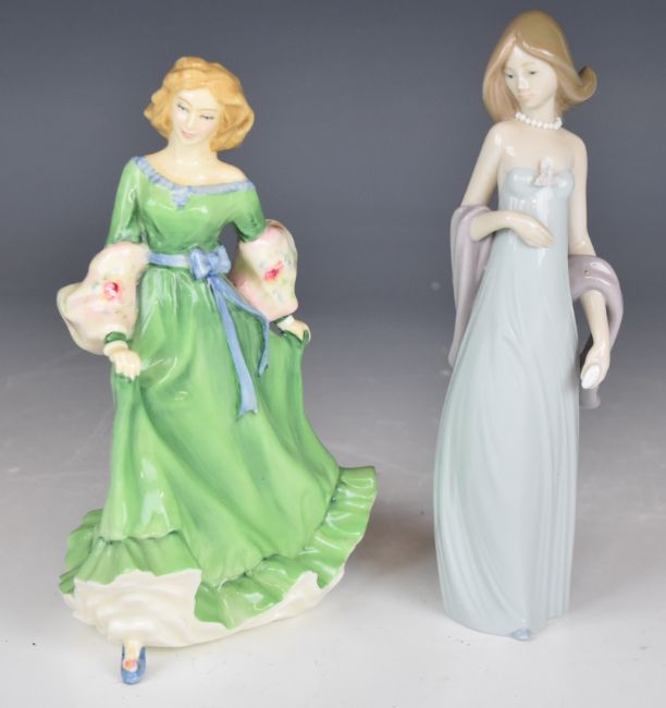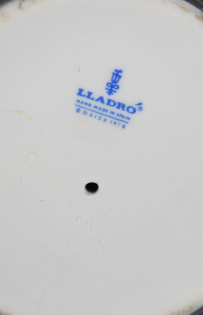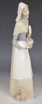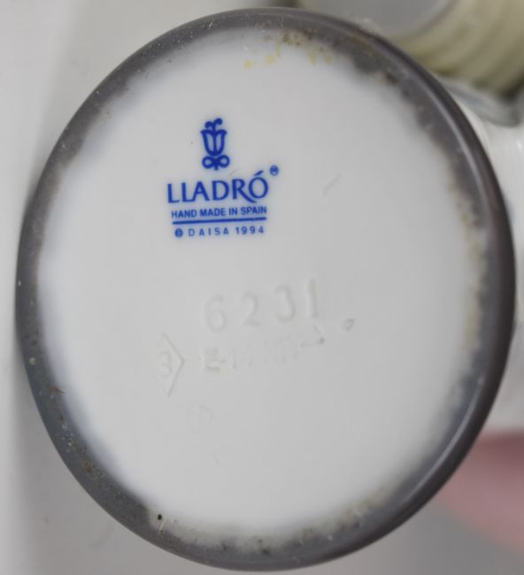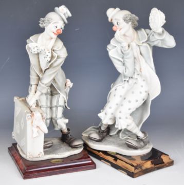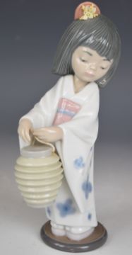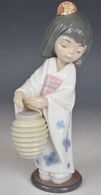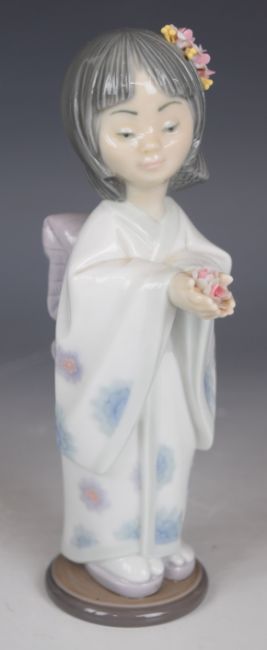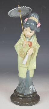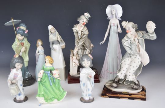 Nine Lladro, Giuseppe Armani for Florence and Royal Doulton figures including Japanese lady with parasol, signed clowns, lady with basket and puppy etc, tallest 36cm