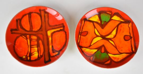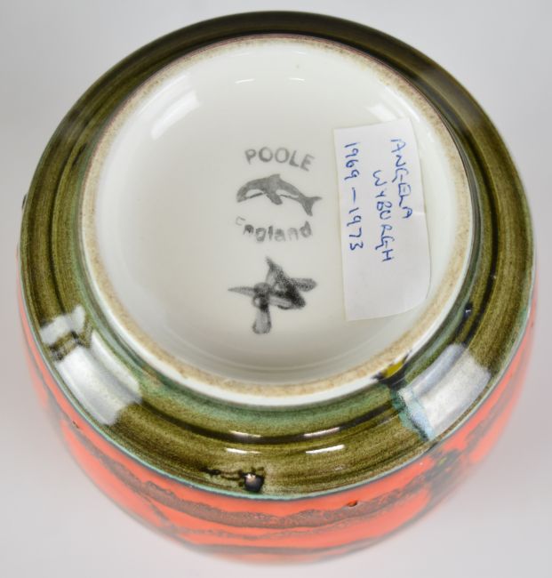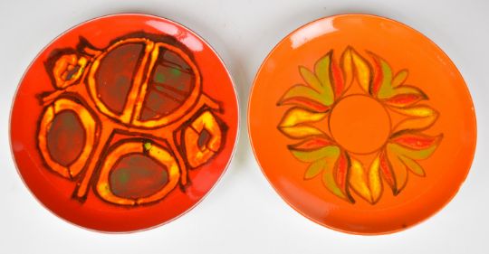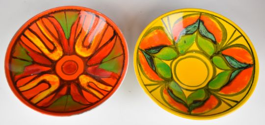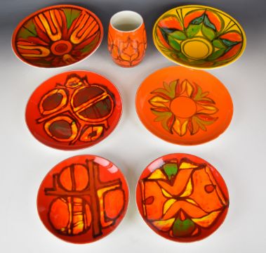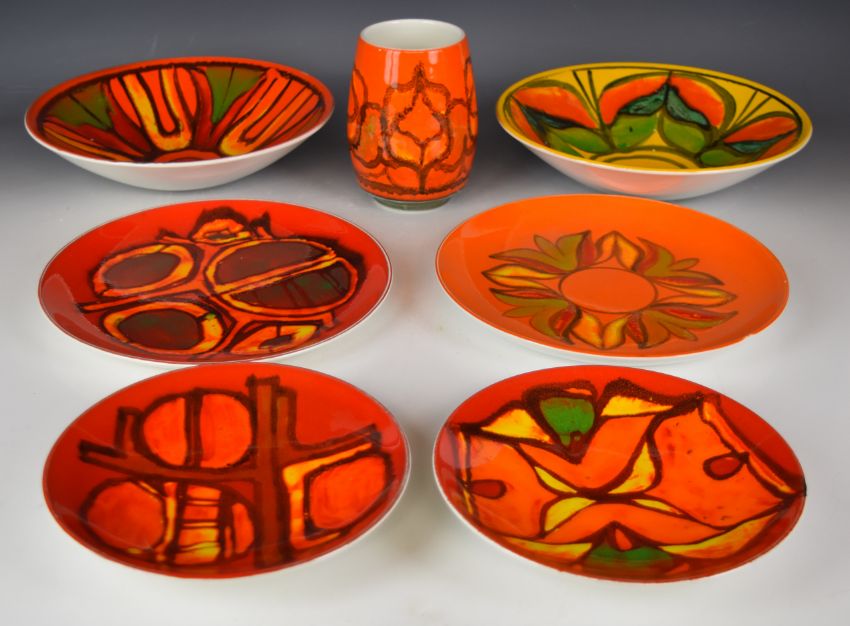 Poole Pottery mid century modern bowls, plates and vases, some in the Delphis range, tallest 14.5, largest diameter 27cm