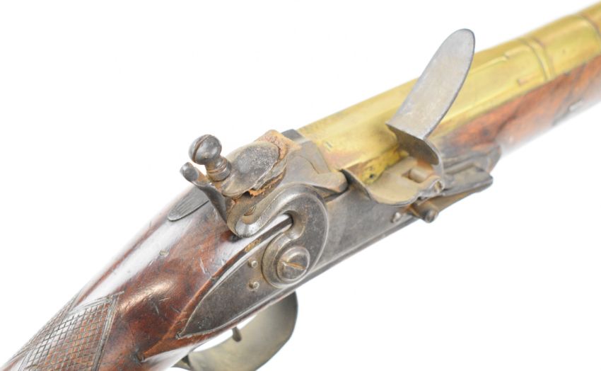 English flintlock blunderbuss with engraved brass butt plate, trigger guard and mounts, chequered grip and 15.5 inch part-octagonal brass barrel stamped 'London' and 'TK' and with crown over 'P' and crown over 'V' proof marks, overall length 79cm.