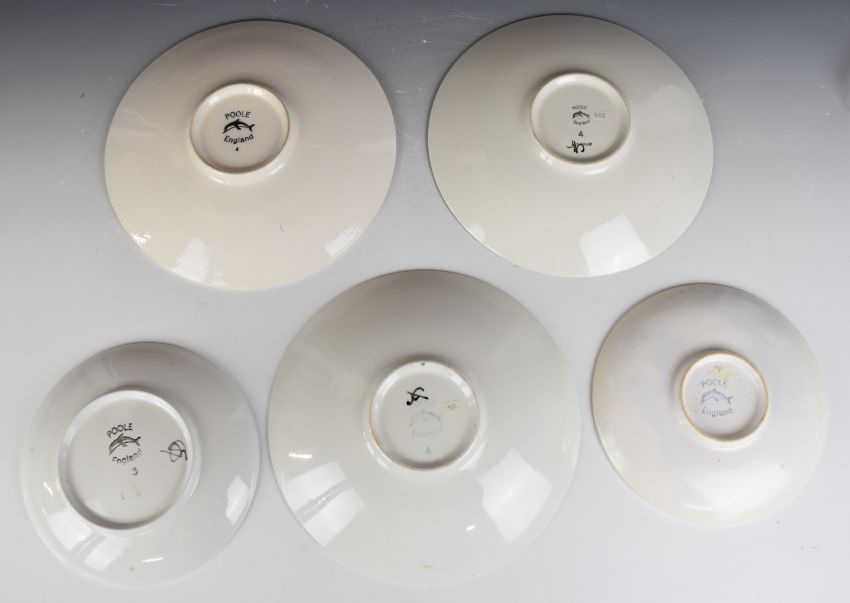 Five Poole Pottery mid century modern plates and shallow bowls including Delphis and Aegean examples, largest diameter 27cm