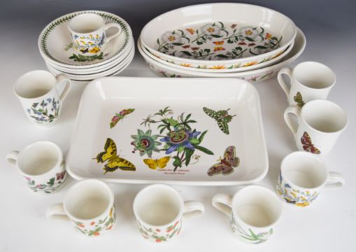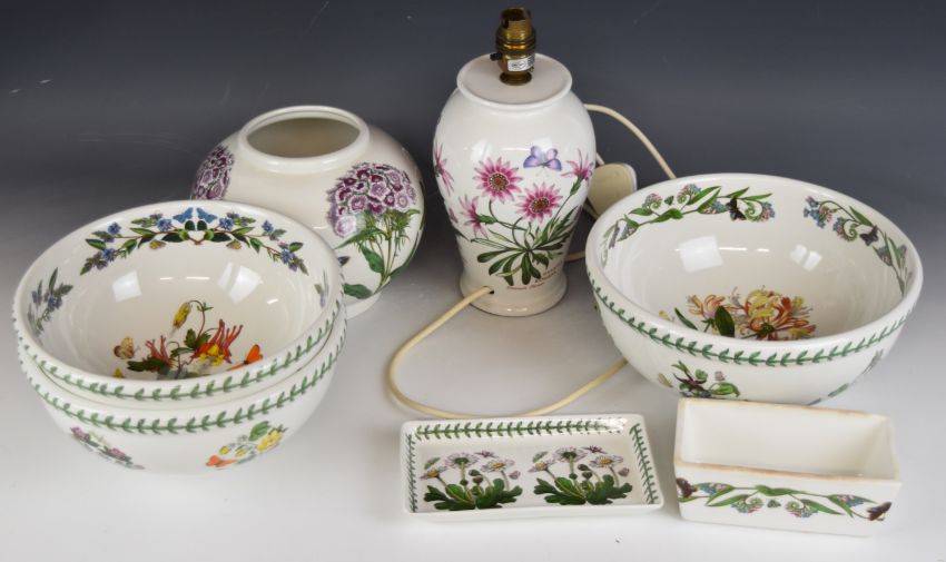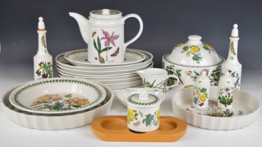 Portmeirion dinner, tea, oven and decorative ware decorated in the Botanic Garden pattern including set of oval plates, casserole dishes, cruet, flan dish, table lamp, butter dish etc, tallest 28cm, approximately eighty two pieces