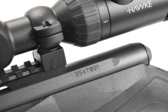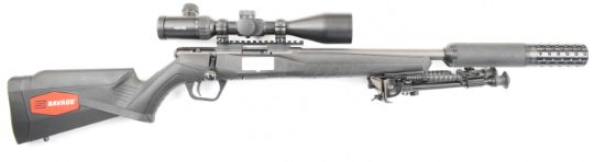 Savage B22 .22 bolt-action rifle with composite stock, textured semi-pistol grip, sling mounts, bi-pod, multi-shot magazine, Hawke Endurance 5-15x50 scope, sound moderator and 16 inch barrel, overall length 102.5cm, serial number 3547801. PLEASE NOTE THAT A VALID RELEVANT FIREARMS CERTIFICATE IS REQUIRED TO VIEW OR PURCHASE THIS LOT AND FOR ALL SHOTGUNS OR RIFLES PLEASE ENSURE YOU HAVE THE RELEVANT CERTIFICATE BEFORE BIDDING.