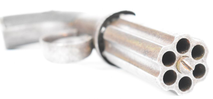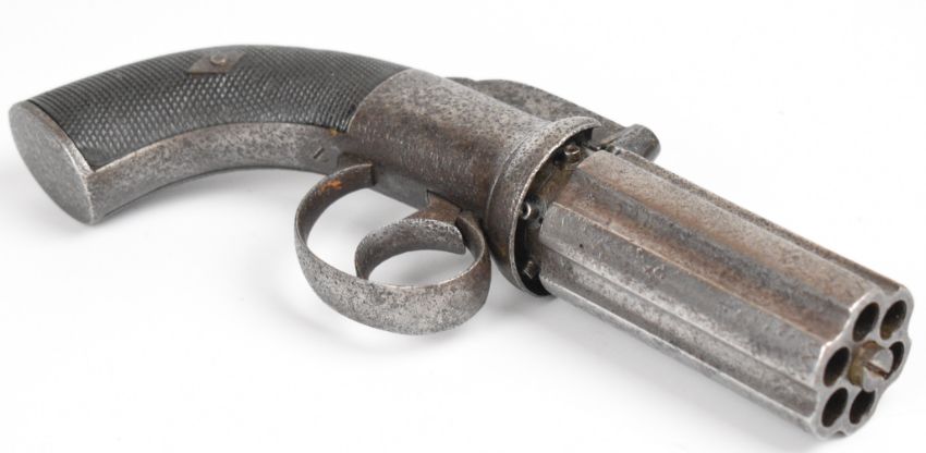 English six-shot percussion bar hammer action pepperbox pistol / revolver with engraved lock, hammer and trigger guard, chequered wooden grips and 3 inch smooth bored barrels, overall length 21cm.