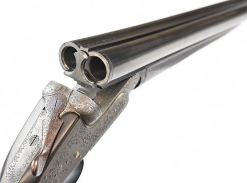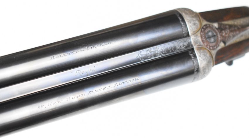 Holland & Holland Royal 16 bore side by side sidelock ejector shotgun with hand detachable locks, fine scrolling engraving to the locks, underside, trigger guard, top plate, thumb lever and fences, chequered grip and forend, carved teardrop to the wrist, vacant gold cartouche to the underside of the stock, single trigger and named 28 inch barrels choked ¼, overall length 114.5cm, length of pull 37cm, serial number 33524, in fitted leather carry case with three original labels. PLEASE NOTE THAT A VALID RELEVANT SHOTGUN CERTIFICATE IS REQUIRED TO VIEW OR PURCHASE THIS LOT AND FOR ALL SHOTGUNS OR RIFLES PLEASE ENSURE YOU HAVE THE RELEVANT CERTIFICATE BEFORE BIDDING.