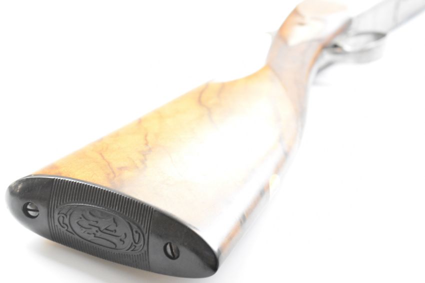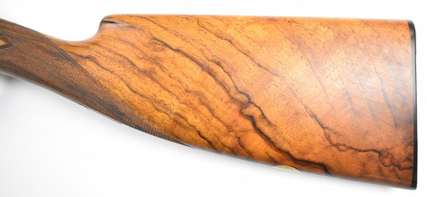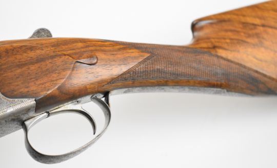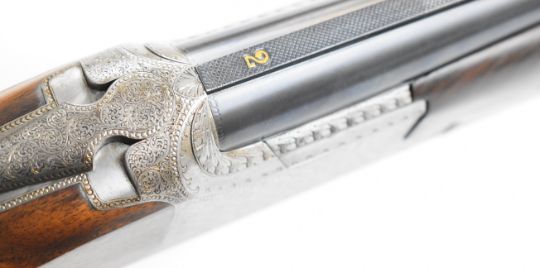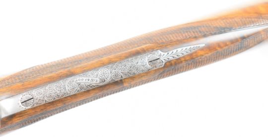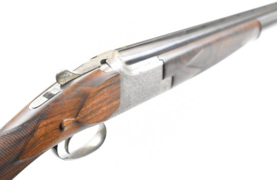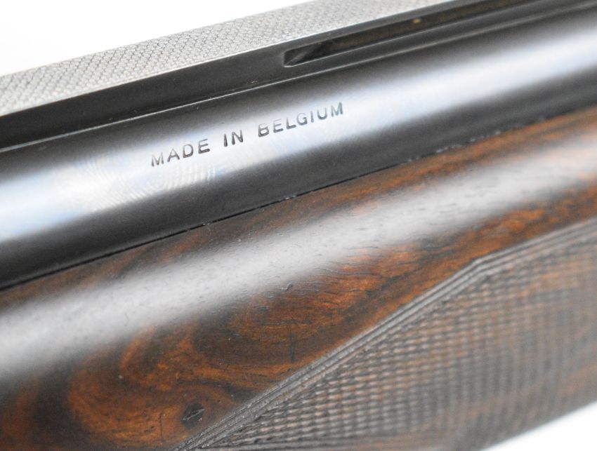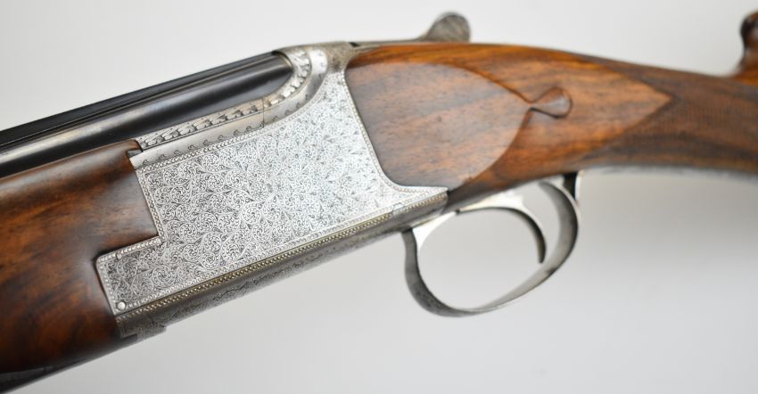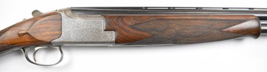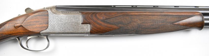 Browning B25 C3 12 bore over and under ejector shotgun with scrolling engraving to the locks, underside, trigger guard, top plate, thumb lever and mounts, chequered grip and forend, carved teardrop to the wrist, engraved gold cartouche to the underside of the stock, single trigger, vented top rib and 26.5 inch barrels choked ½ and ¾, overall length 110.5cm, length of pull 36.5cm, serial number 20014573, in original fitted case. PLEASE NOTE THAT A VALID RELEVANT SHOTGUN CERTIFICATE IS REQUIRED TO VIEW OR PURCHASE THIS LOT AND FOR ALL SHOTGUNS OR RIFLES PLEASE ENSURE YOU HAVE THE RELEVANT CERTIFICATE BEFORE BIDDING.