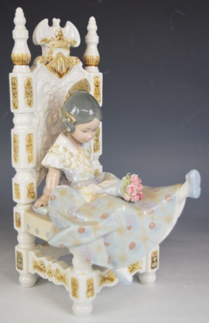 Lladro child figure Naughty Girl Full of Mischief, seated girl with flowers and raised leg, H27cm