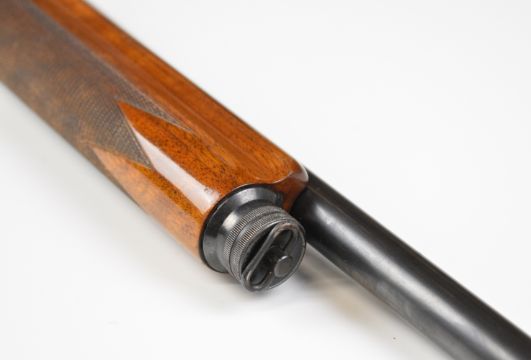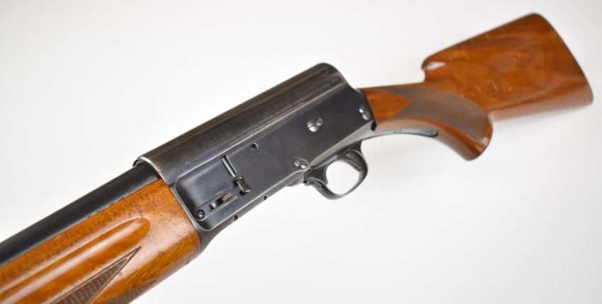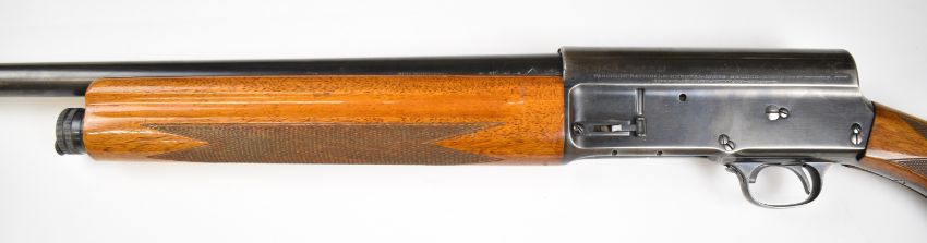 Browning A5 12 bore 3-shot semi-automatic shotgun with chequered semi-pistol grip and forend and 28 inch barrel choked ¼, overall length 120.5cm, length of pull 36.5cm, serial number 38983. PLEASE NOTE THAT A VALID RELEVANT SHOTGUN CERTIFICATE IS REQUIRED TO VIEW OR PURCHASE THIS LOT AND FOR ALL SHOTGUNS OR RIFLES PLEASE ENSURE YOU HAVE THE RELEVANT CERTIFICATE BEFORE BIDDING.