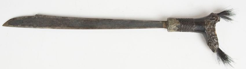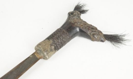 Borneo Dayak style head hunter's sword with decorated wood hilt, 33cm straight blade and wooden scabbard, with ancillary long handled knife and a Touareg bag / pouch. PLEASE NOTE: WE ARE NOT ABLE TO OFFER OUR USUAL POSTAGE SERVICE FOR THIS LOT