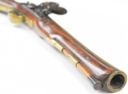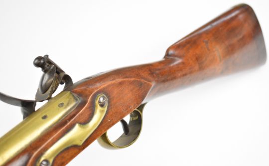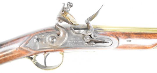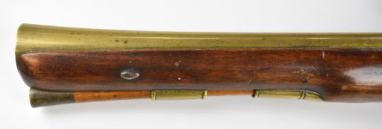 H W Mortimer & Son of London flintlock blunderbuss with named lock, safety, brass butt plate and trigger guard, horn tipped wooden ram-rod and 14 inch brass barrel engraved 'H.W. Mortimer & Son. London. Gun-Makers To His Majesty', overall length 75cm.