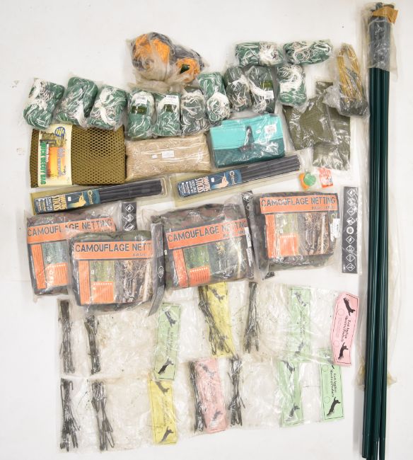 A collection of shooting and hunting related items, Caldwell shooting sticks, woodland camo, hide poles, ferreting/ rabbit purse nets, game bag etc, some in original packaging.